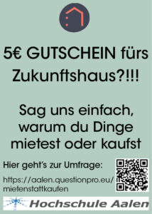 In Zusammenarbeit mit der Hochschule Aalen haben wir eine Umfrage gestartet zum Thema: Was bewegt die Menschen Dinge zu mieten statt sie zu kaufen? Nimm an unserer kurzen Umfrage teil und erhalte einen 5€ Gutschein für das Zukunftshaus. Die Umfrage ist bis 31.07. geschaltet und hier erreichbar: https://aalen.questionpro.eu/mietenstattkaufen