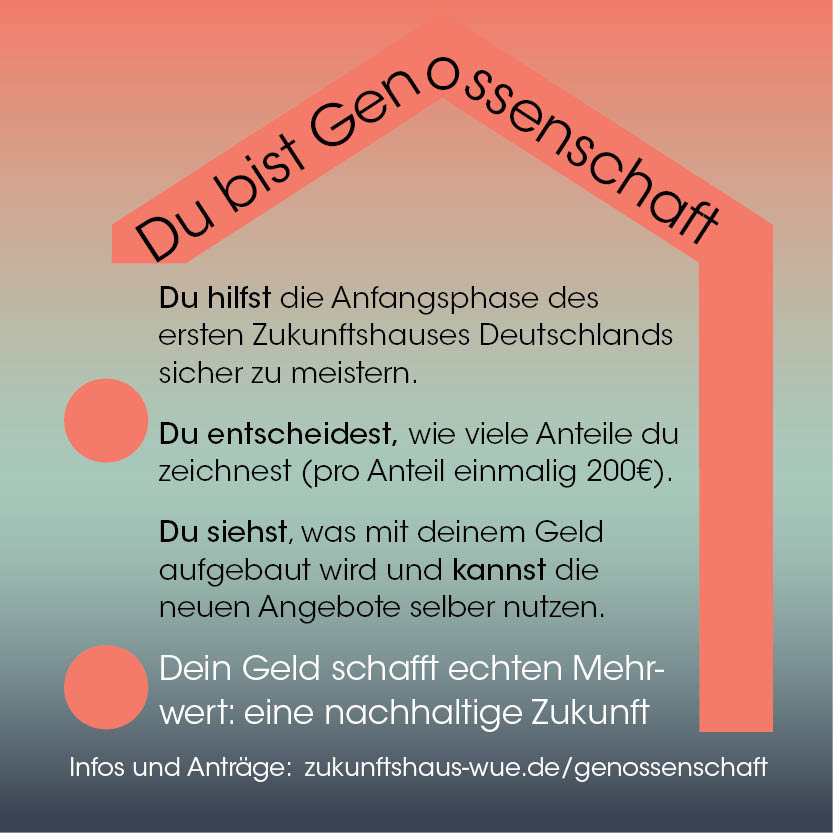 Die Beitrittserklärung kannst du komplett online ausfüllen und unterschreiben oder ausdrucken und handschriftlich ausfüllen. Bitte schicke sie uns dann per Mail an genossenschaft@zukunftshaus-wue.de, bringe sie persönlich vorbei oder schicke sie per Post an: Zukunftshaus eG, Augustinerstr. 4, 97070 Würzburg.