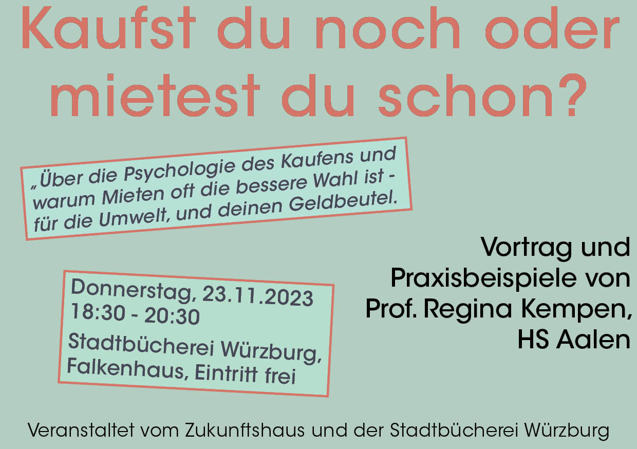 Warum kaufen wir so gerne und wie können wir es schaffen, dass wir mehr in Nutzen statt ins Besitzen kommen. Mit diesen Fragen beschäftigt sich Prof. Dr. Regina Kempen an der Hochschule Aalen (vorher Universität Würzburg). Am 23.11.2023 um 18:30 wird sie ihre aktuellen Forschungsergebnisse in der Stadtbücherei im Falkenhaus vorstellen. Der Eintritt ist frei.