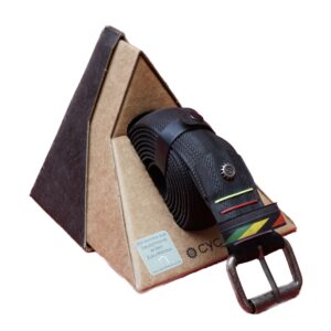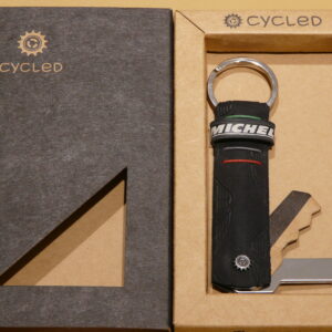 Cycled upcycelt die Laufflächen von Rennrad-Reifen. Die Verpackung ist komplett aus recyceltem Karton hergestellt. Nur die 1% für Komponenten wie Schnallen und Schrauben sind Neuware aus Italien.