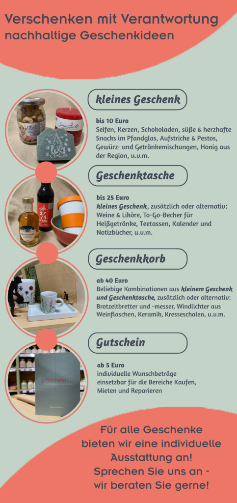 Wenn Ihnen die Wahl schwerfällt, bieten wir ebenso Gutscheine an. Die Gutscheine können die Beschenkten in unserem Ladengeschäft vielfältig einsetzen: Für den Einkauf der nachhaltigen Produkte, für das Mieten aus unserem 350 Gegenstände umfassenden Mietsortiment oder für die Reparatur eines defekten Elektrogerätes.
