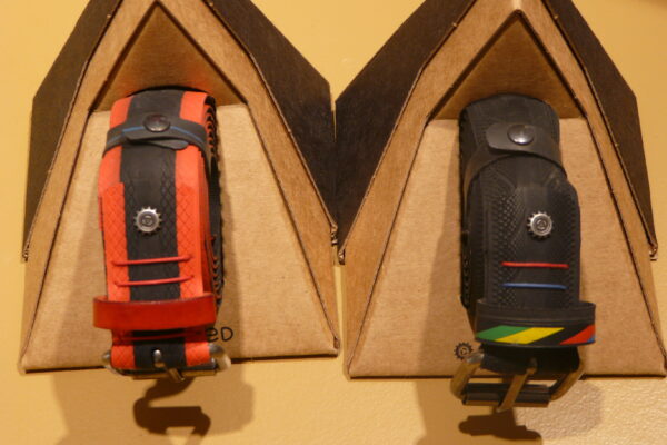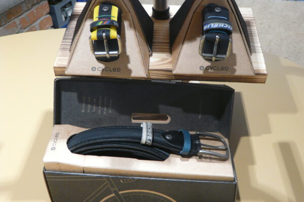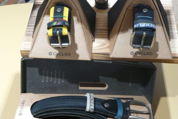 Cycled upcycelt die Laufflächen von Rennrad-Reifen. Die Verpackung ist komplett aus recyceltem Karton hergestellt. Nur die 1% für Komponenten wie Schnallen und Schrauben sind Neuware aus Italien.