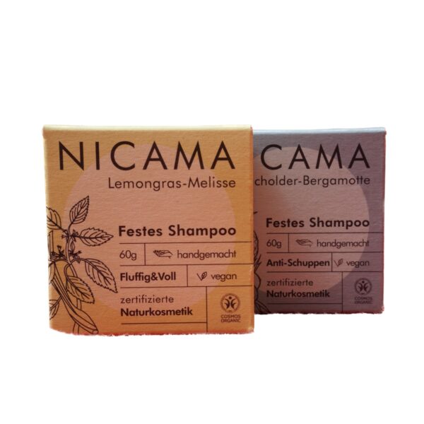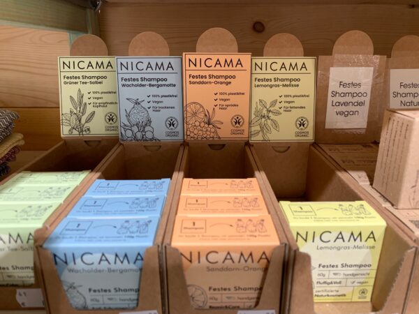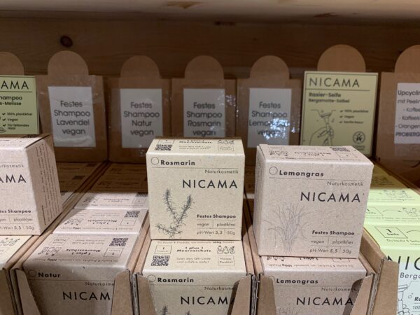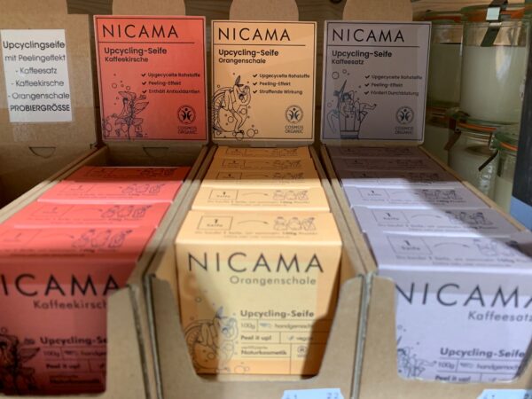 Die Seifen und festen Shampoos von nicama beinhalten je nach Produkt zwischen 2 und 30% recycelte Rohstoffe wie Kaffeesatz, Kaffeekirschen, Orangenschalen und gereinigtes Donutöl (baldiger Launch).