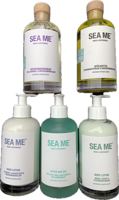 Die Kosmetik von SeaMe wird in Pfandgläser abgefüllt, welche bei Händlern deutschlandweit zurück in den Kreislauf gebracht werden können. Die Kosmetik wird in Deutschland abgefüllt und ist Peta vegan und cruelty free.