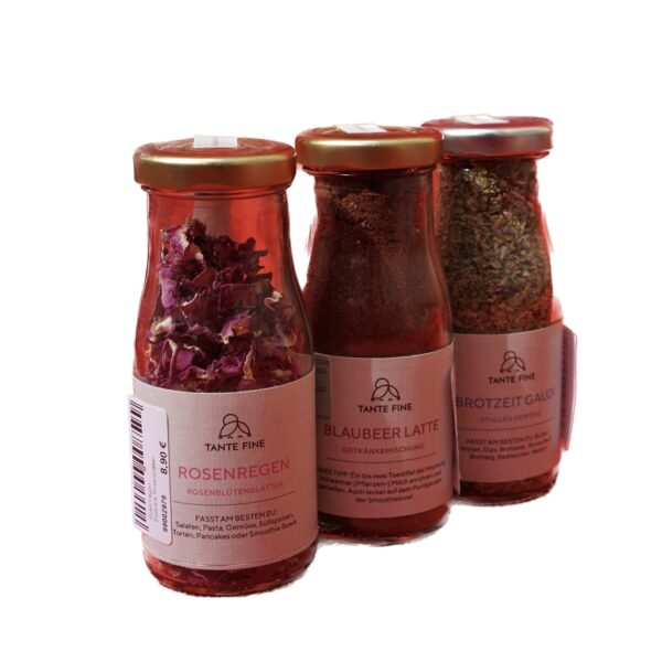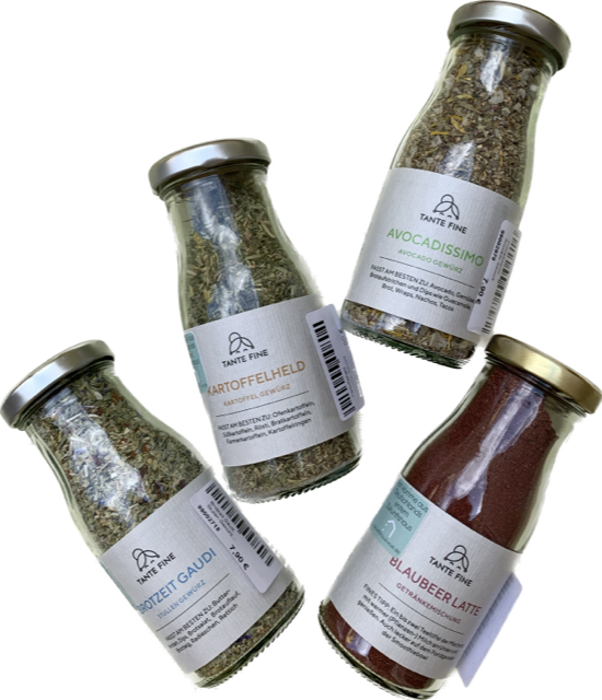 Bei der Verpackung verwendet Tante Fine ausschließlich Karton und Papier. Die einzelnen Gewürze werden in Glasflaschen abgefüllt. Diese sind recyclebar und können außerdem wunderbar weiterverwendet werden.