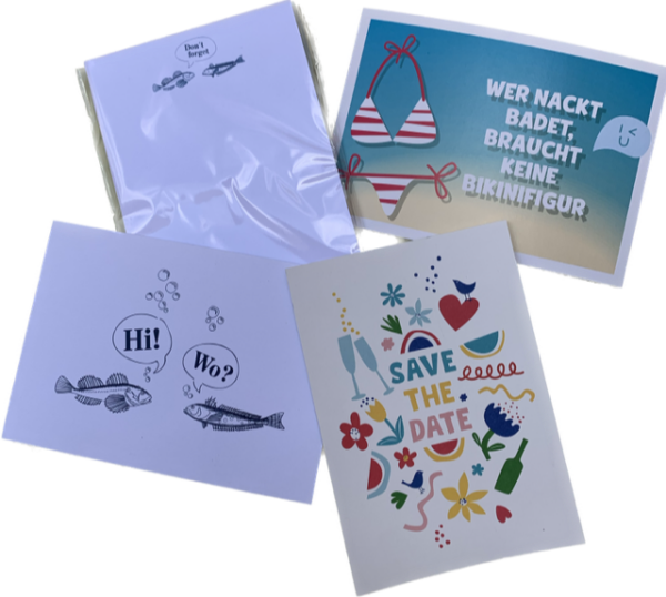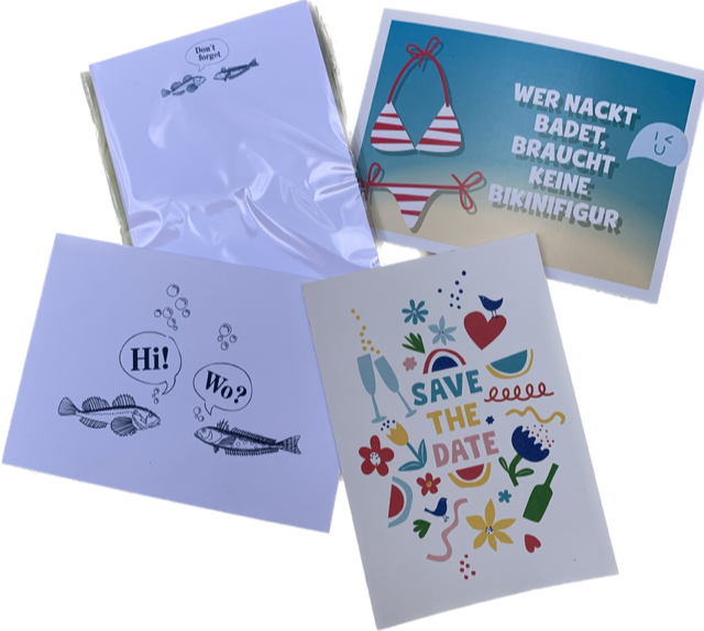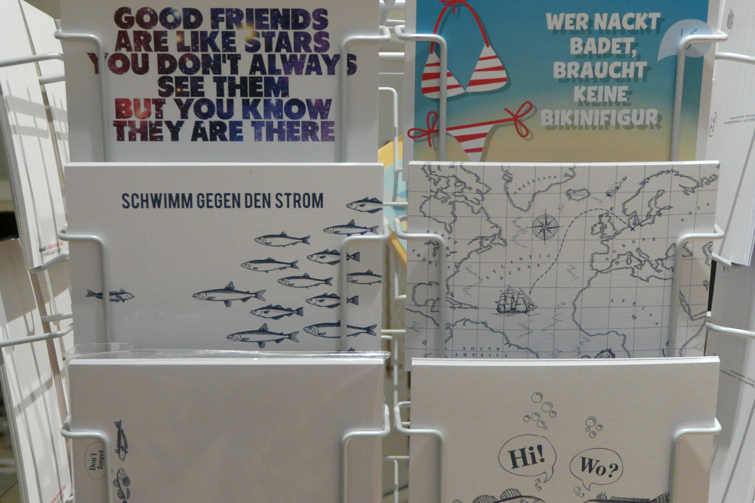 Die Postkarten, Grußkarten, Blöcke und das Geschenkpapier stammen zu 100% aus Recyclingpapier. Nur bei einigen Grußkarten ist der Umschlag FSC-Zertifiziert mit Papier aus nachhaltiger Forstwirtschaft.