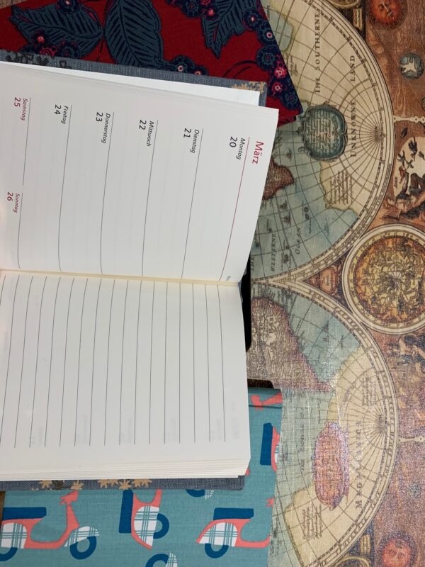 Die blanko Bücher sind aus 100% Recyclingpapier. Die Produktion erfolgt ohne optische Aufheller und ohne Deinking in einem CO2 neutralen Produktionsprozess. Der verwendete Buchleim ist vegan. Die Bezugsstoffe sind Stoffspenden, die upgecycelt werden. Für die punktkarierten Bücher und Kalender wird Papier mit dem FSC Siegel verwendet