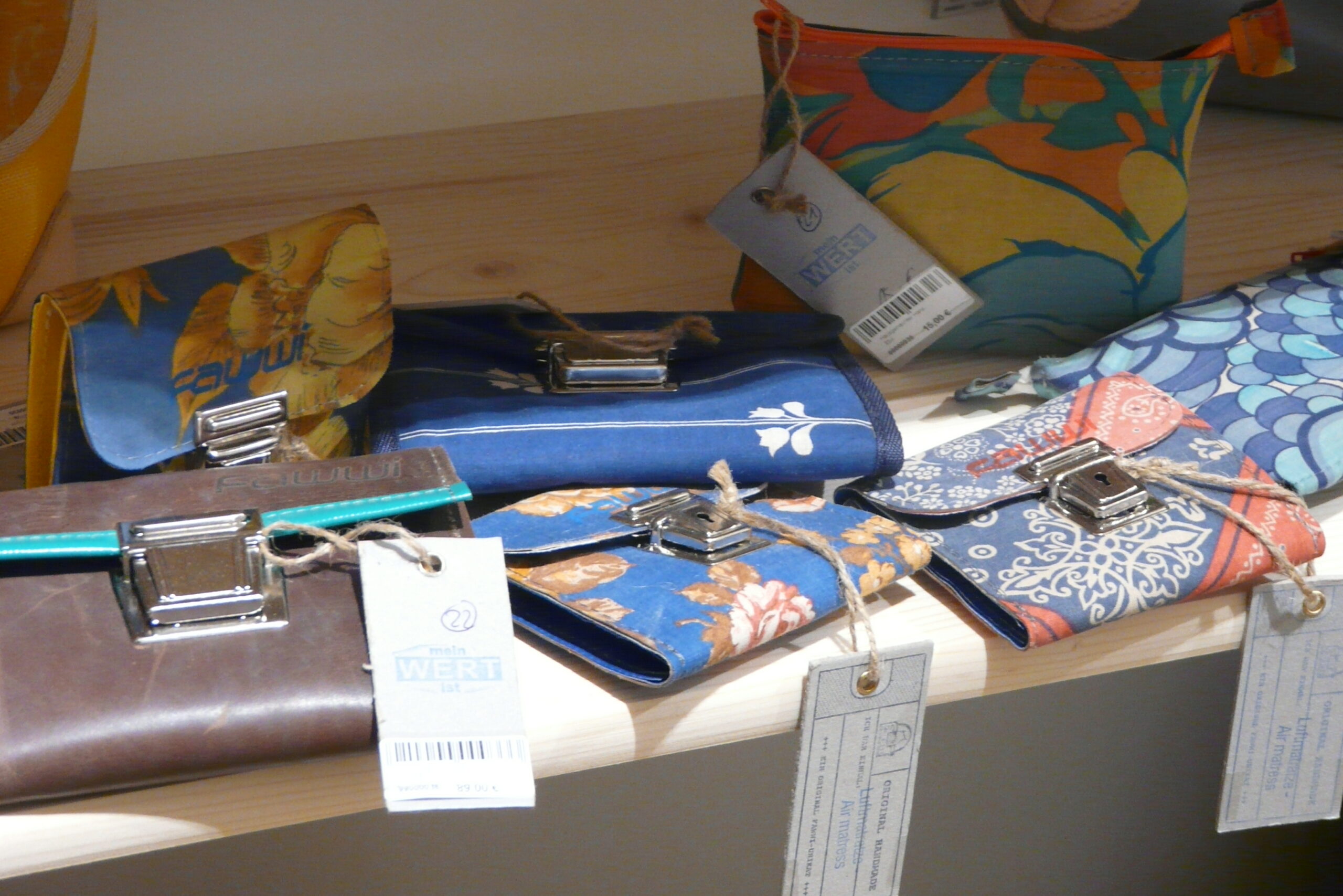 Die Taschen, Börsen und Beutel werden aus alten Luftmatratzen, Sakkos und Zeltplanen hergestellt.