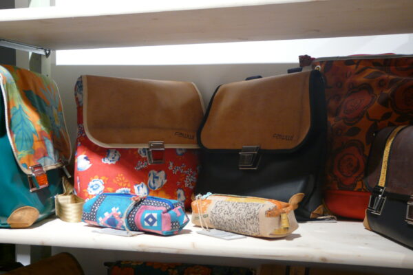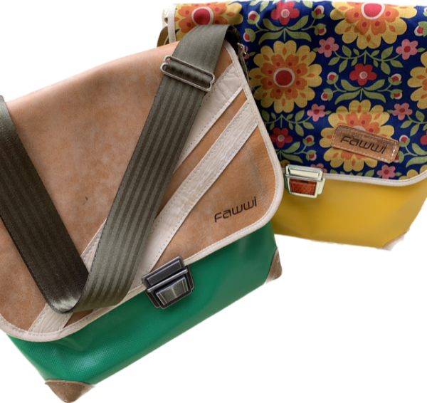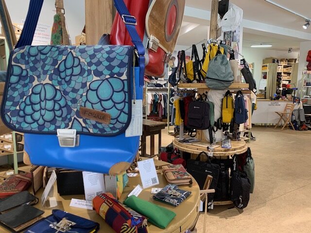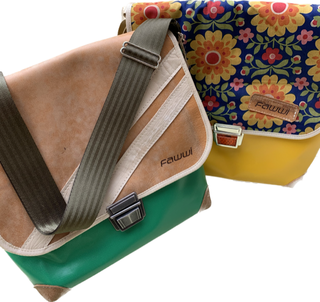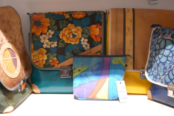 Die Taschen, Börsen und Beutel werden aus alten Luftmatratzen, Sakkos und Zeltplanen hergestellt.