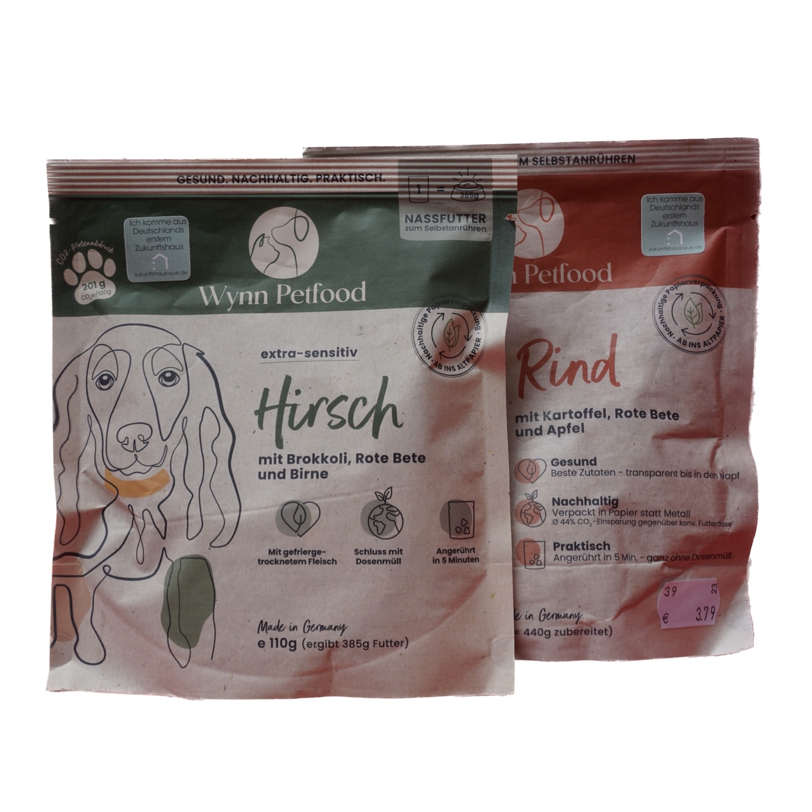 Im Vergleich zu herkömmlichem Dosenfutter hat das Futter zum Selbstanrühren einen halb so großen ökologischen Fußabdruck. Dieser ist auf der Verpackung genau nachvollziebar.
