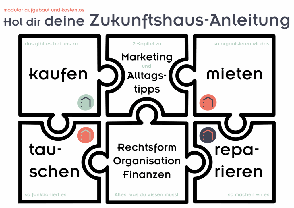 Die Anleitung ist frei verfügbar. Und sie ist modular aufgebaut, d.h., es ist nicht nur ein Bauplan „von null an zum Zukunftshaus“, sondern auch eine Inspirationsquelle für bestehende Geschäfte und Projekte, welche z.B. um einen oder zwei Bereiche erweitert werden können. Oder es finden sich Menschen, die nur einen oder zwei Bereiche umsetzen möchten und sich hier wertvolle Informationen holen können. Wenn du die Anleitung in höherer Auflösung brauchst oder als gedrucktes Exemplar, dann kontaktiere uns gerne.